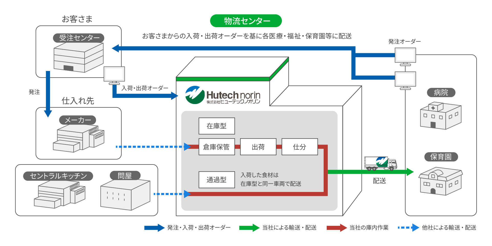 病院や保育園など、医療施設・保育施設・福祉施設の厨房へ食材をお届けします。施設を利用される方にとって、食事は楽しみの一つであり、生きる力となります。ヒューテックノオリンでは食の安心と安全を守るため、専用の衛生管理を行っています。メニューは毎日変わり、利用される方のお身体の状態に合わせてもメニューは異なります。その分、厨房では使用する食材の種類は多く、ロット数は少なくなりがちです。厨房が一回で受け取れ、手際よく調理を進められるよう、ヒューテックノオリンでは冷凍食材とチルド食材の同時配送を行っています。