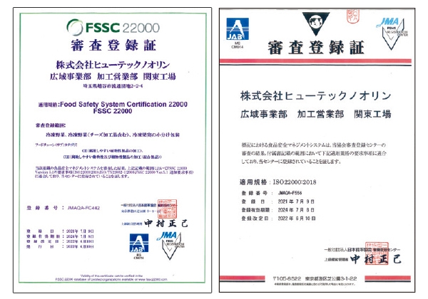 国際規格の食品安全マネジメントシステムFSSC22000 を取得済です(関東工場)。
