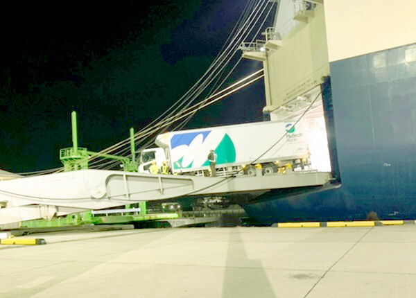 国内の加工食品の輸配送では、食品の安心・安全のために、適確な温度管理や日付管理が求められています。また、日々の食卓をより彩り豊かにするため、多品種を多頻度かつ小口でジャストインタイムにお届けできる体制を構築してきました。それに最も適した手段がトラック輸送ですが、地球温暖化対策としてのGHG排出量の削減や、交通渋滞の緩和、トラックドライバーの減少や働き方改革へ対応するためには、トラック輸送から地球環境負荷の少ない鉄道や船舶への貨物輸送手段の転換(モーダルシフト)が有効とされています。ヒューテックノオリンにおいても荷主と充分検討したうえで、コンテナによる鉄道輸送や、貨物用船舶(RORO船)での輸送を行っています。