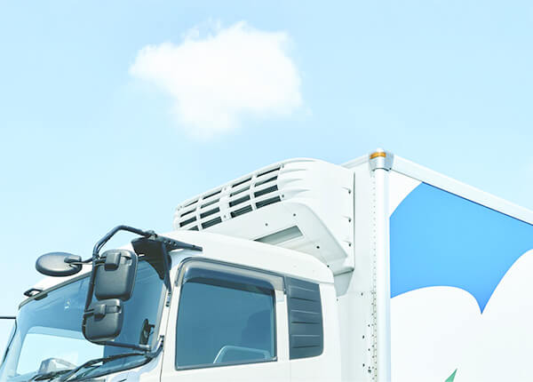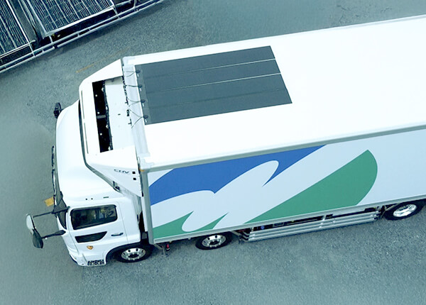 冷凍食品の輸配送に使用する冷凍トラックは、常に荷台内を適確な温度に保つため、専用の冷凍機を備えています。冷凍機はエンジンによって駆動し、他のトラックよりも燃費が低下しやすいため、ヒューテックノオリンでは車載型太陽光発電装置など燃費改善のための施策にも取り組んでいます。