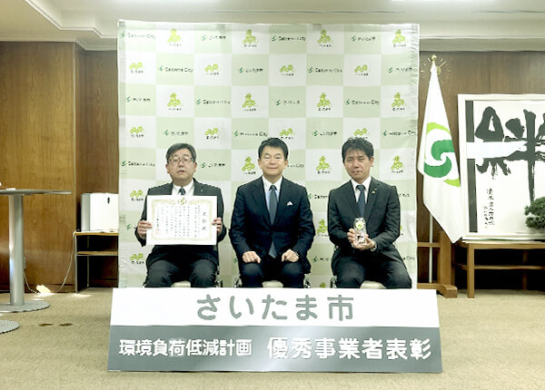 2025年2月、ヒューテックノオリン埼玉支店は、さいたま市より令和6年度「さいたま市環境負荷低減計画優秀事業者」として表彰されました。これは環境への負荷が相当程度大きい事業所を設置(管理)する事業者に対し、温室効果ガスの削減等に関する計画を作成、提出、公表する制度で、埼玉支店は2026年度までに温室効果ガス排出量を70%削減(2018年度対比)することを目標とし、2023年度に目標を達成しました。